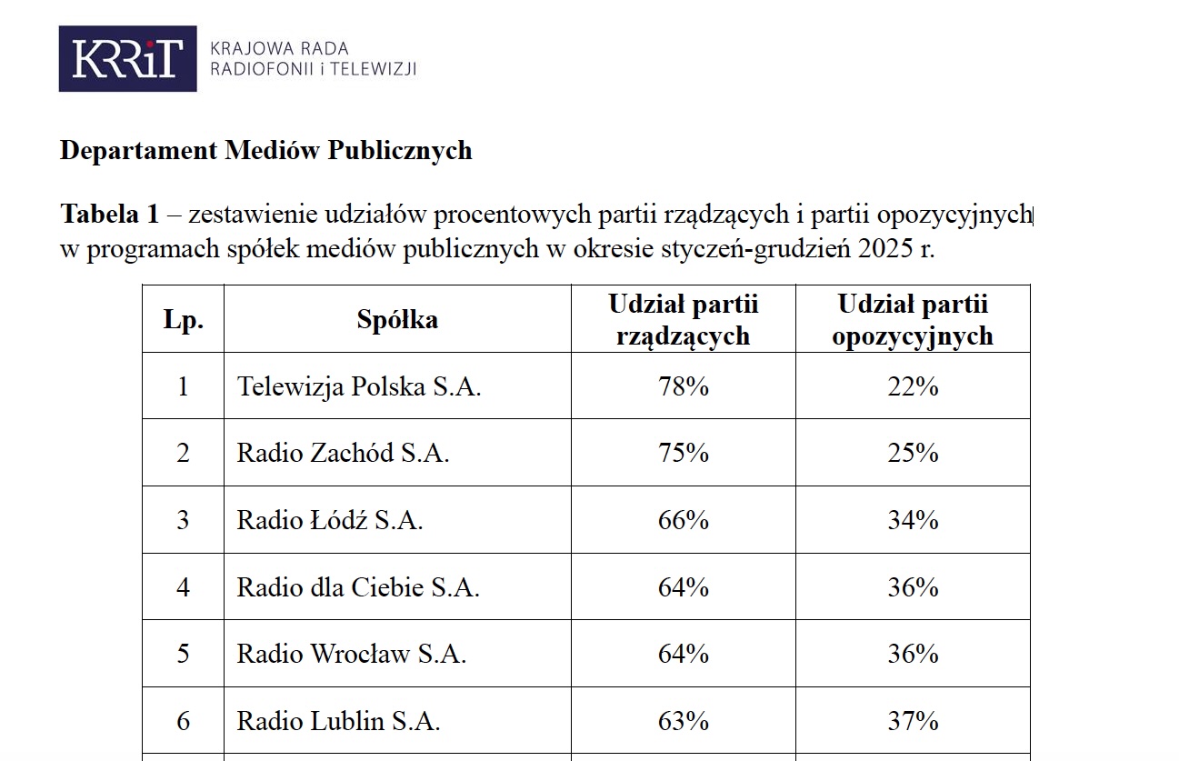 W 2025 roku aż 75 proc. czasu antenowego poświęconego partiom politycznym przypadło ugrupowaniom rządzącym, a jedynie 25 proc. – opozycji. To najgorszy wynik wśród publicznych nadawców radiowych i drugi – po Telewizji Polskiej, w tym TVP INFO – w całym sektorze mediów publicznych.